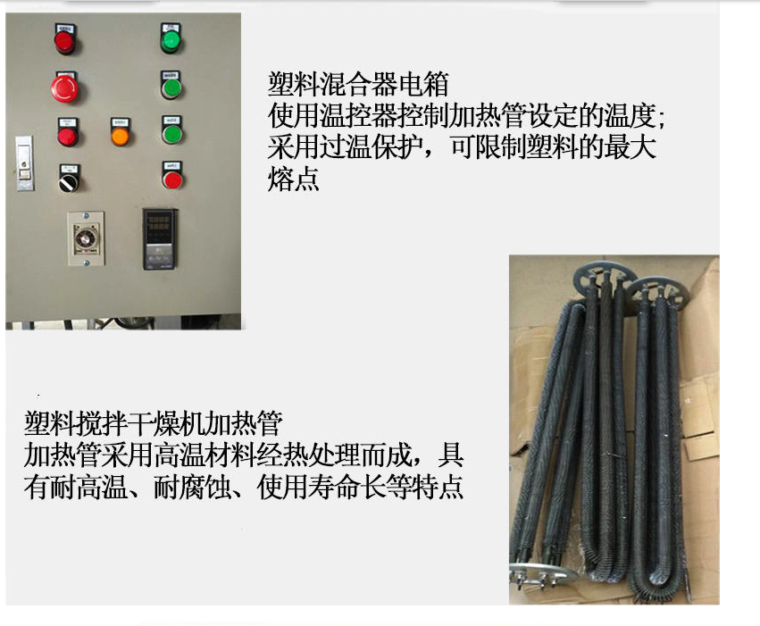 8、干燥混合功能二合一,但不需要干燥时,只需将“加热开关”及“风机开关”关闭,本系列机型即可用于塑料搅拌均化用途,一机二用;